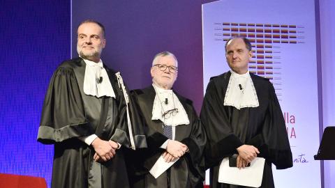 In sottofondo un cuore che batte. Un timer sul maxischermo. Una voce fuoricampo annuncia: “Ha inizio il processo alla tecnologia, entri il tribunale”. Uno alla volta, vengono presentati i tre giudici d’eccellenza. Il primo ad entrare è il Presidente della Giuria: Massimo Inguscio - Presidente del Consiglio Nazionale delle Ricerche - Poi entra il giudice a latere, Guido Saracco, Rettore del Politecnico di Torino. Dopo di lui, il Rettore dell’Università degli Studi di Torino, Stefano Geuna. Sullo sfondo, i disegni nasuti del fumettista Joshua Held, l’artista di tribunale: una performance in diretta che viene man mano proiettata sullo schermo dell’Aula Magna.